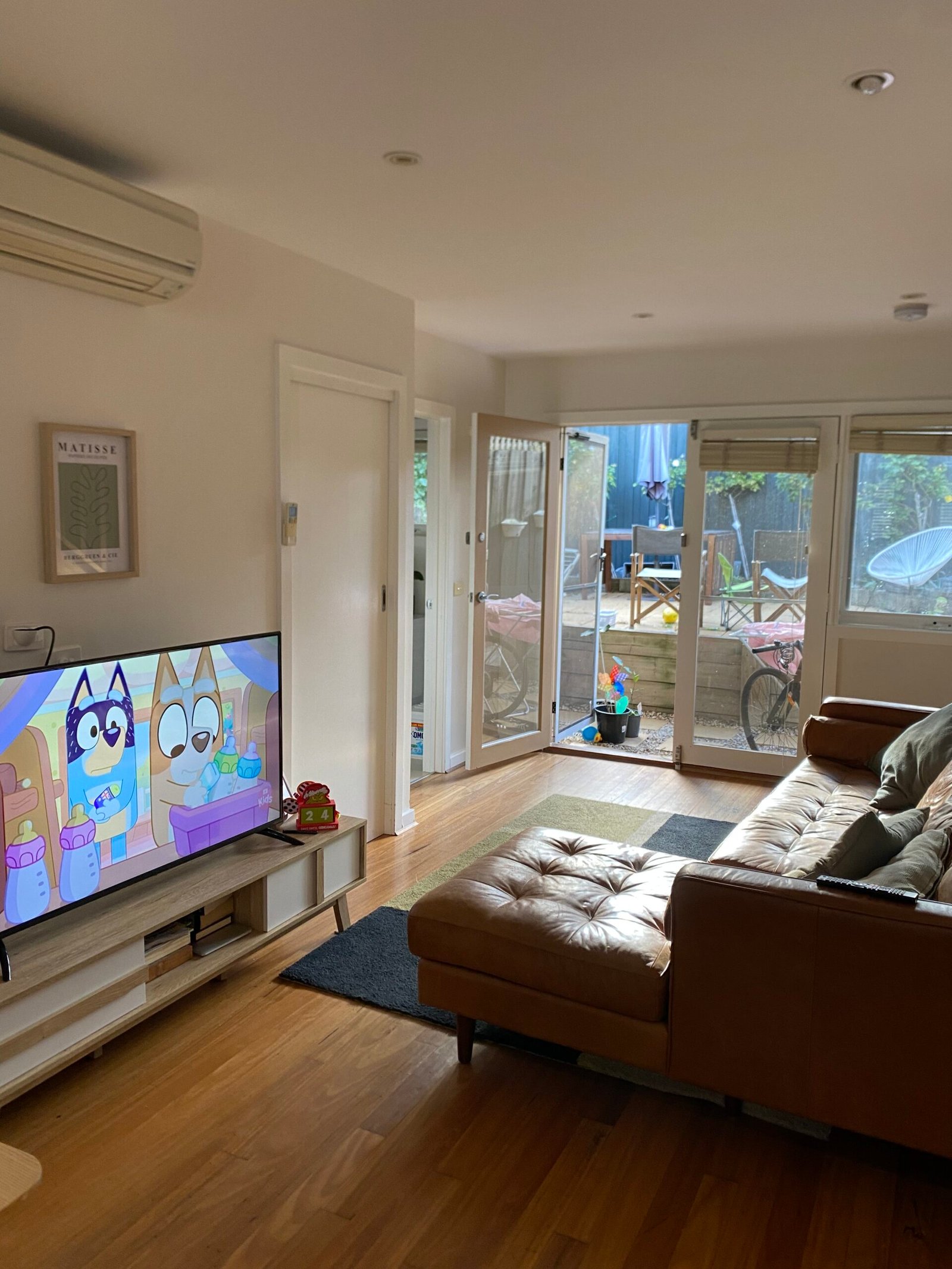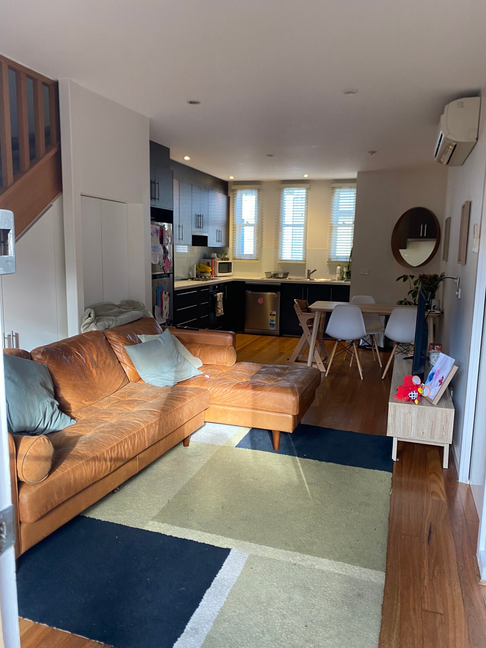 – Huge open plan living, dining and kitchen with split system and polished floor boards